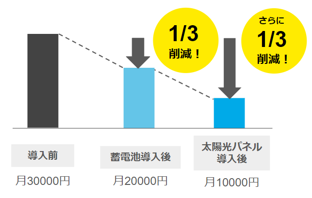 太陽光パネルと蓄電池を両方設置することで「溜めて使う」ことができ、電気代を最大で3分の2削減が可能です!