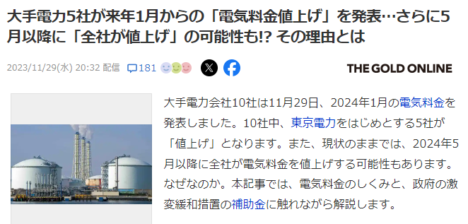 2024年1月から電気代がさらに値上がり!